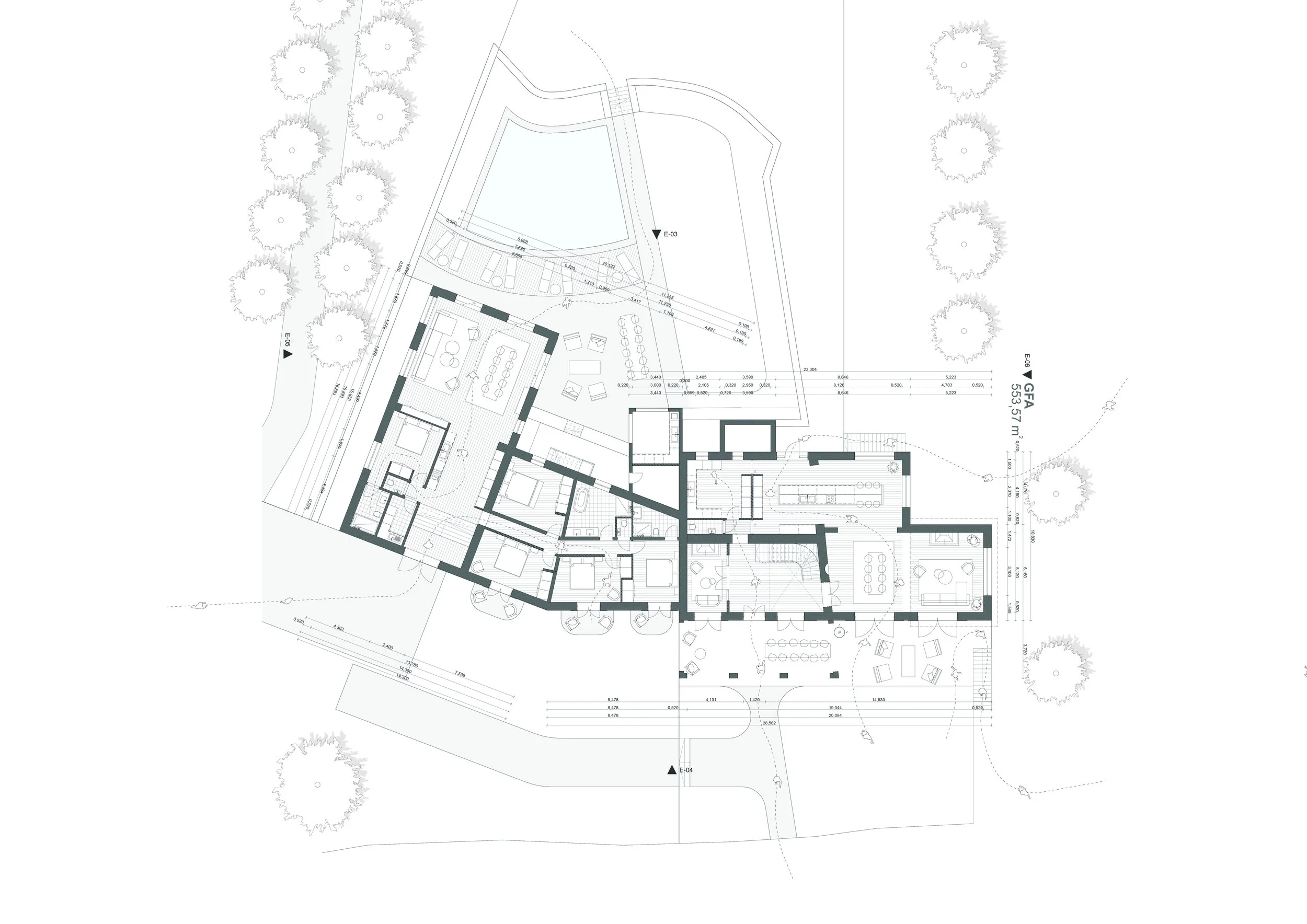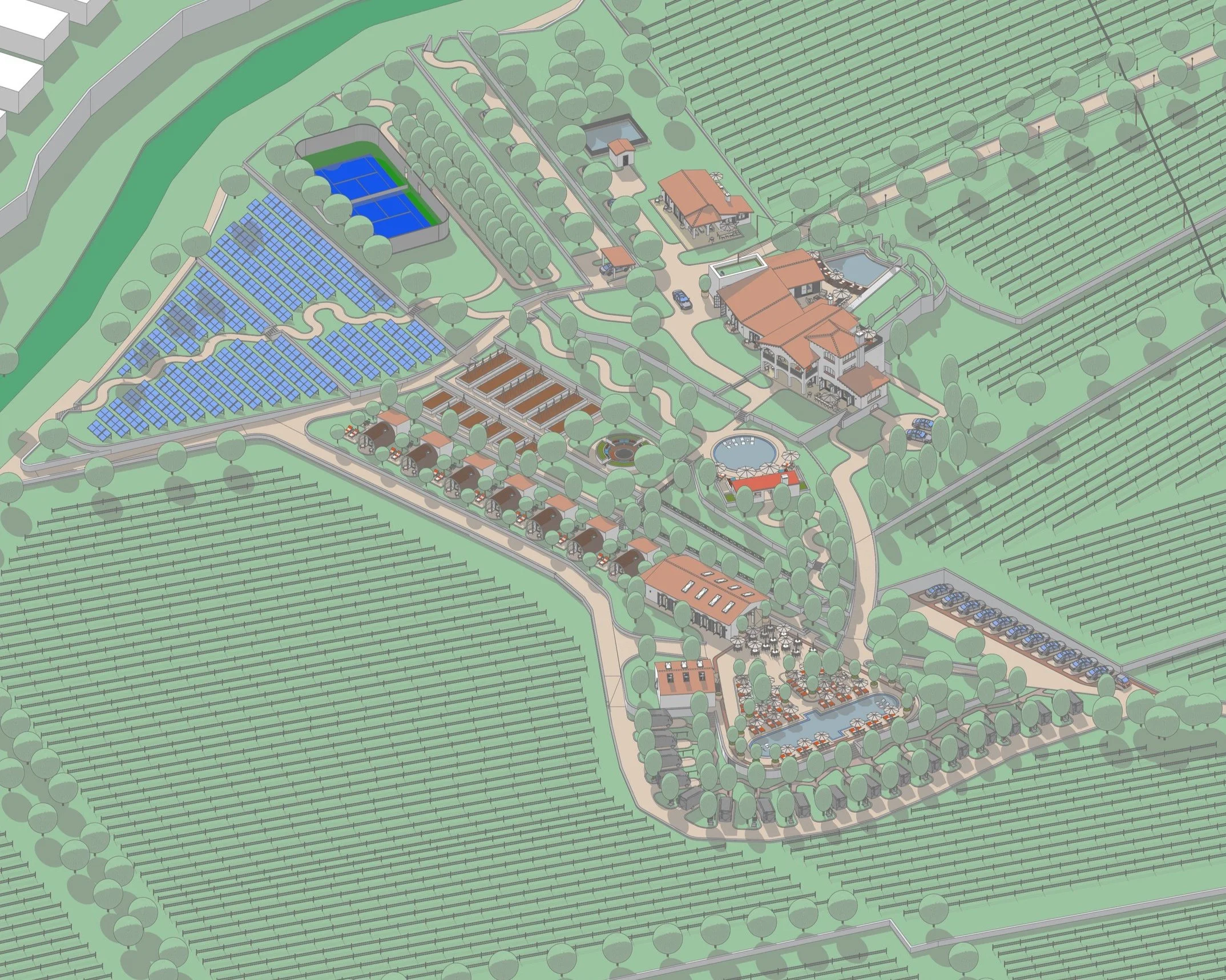 the destination for wine enthusiasts. The estate, originally of a private nature, will become partially accessible to visitors after the transformation. A central wine sales and tasting location will be established in the former barn on the property, serving as the future reception building. The adjacent barn will be renovated into a bathhouse for the seventeen camper parking spots situated on the lower level, each boasting a unique view of the vineyards. Behind the reception building, seven short-stay rentals will be created, also offering a distinctive view of the vineyards—perfect for visitors who prefer not to travel far after their wine tasting experience. These functions will come together at 'La Plaza de Finca,' where a pool area with sunbeds and a spacious terrace will be provided for the guests. This central outdoor space will be ideal for hosting special events such as weddings or wine tastings.
